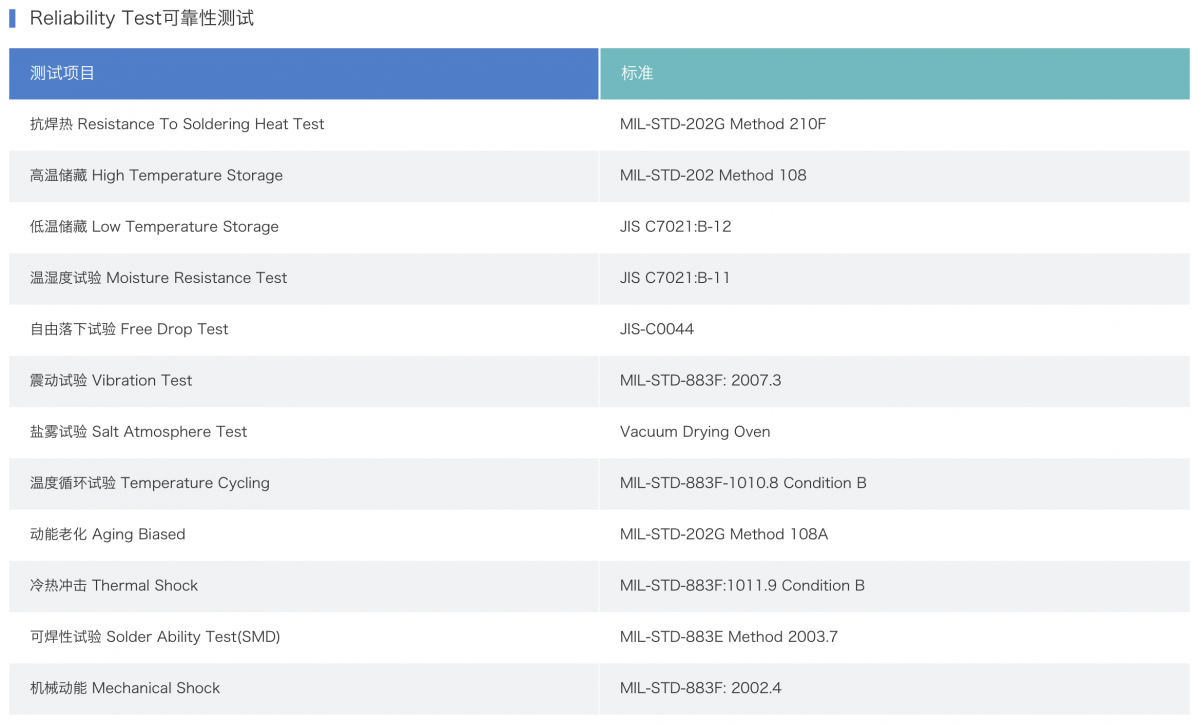 3. 高可靠性: 晶振的高可靠性是指其在長(zhǎng)時(shí)間運(yùn)行中能夠保持穩(wěn)定性能,不會(huì)因?yàn)榄h(huán)境變化或其他因素而出現(xiàn)故障或性能下降的特性。晶振的可靠性測(cè)試如下:冷熱沖擊試驗(yàn)、耐焊接熱試驗(yàn)、跌落試驗(yàn)、振動(dòng)試驗(yàn)、高低溫儲(chǔ)存試驗(yàn)、溫度循環(huán)試驗(yàn)。