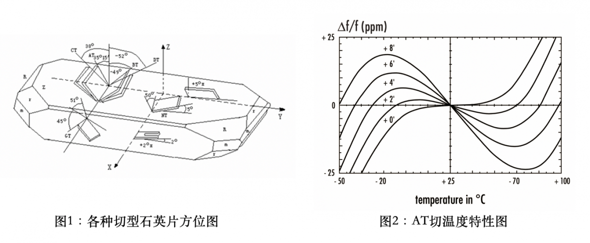 石英晶體在電路中用作時(shí)間或者頻率基準(zhǔn)源,堪稱設(shè)備心臟。決定著電子設(shè)備的性能穩(wěn)定性。石英片的切角和石英諧振器有著密切的關(guān)系。AT切的切角為35°15' 是晶體諧振器里最常用的切型 (見圖1)。頻率和溫度是三次函數(shù)關(guān)系 (見圖2)。