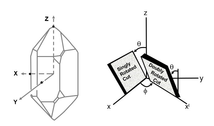 石英片的切角和晶體的性能有著密切的關(guān)系,例如老化特性,頻率穩(wěn)定性等。不同的切割方式可以用XYZ坐標(biāo)來(lái)定義。